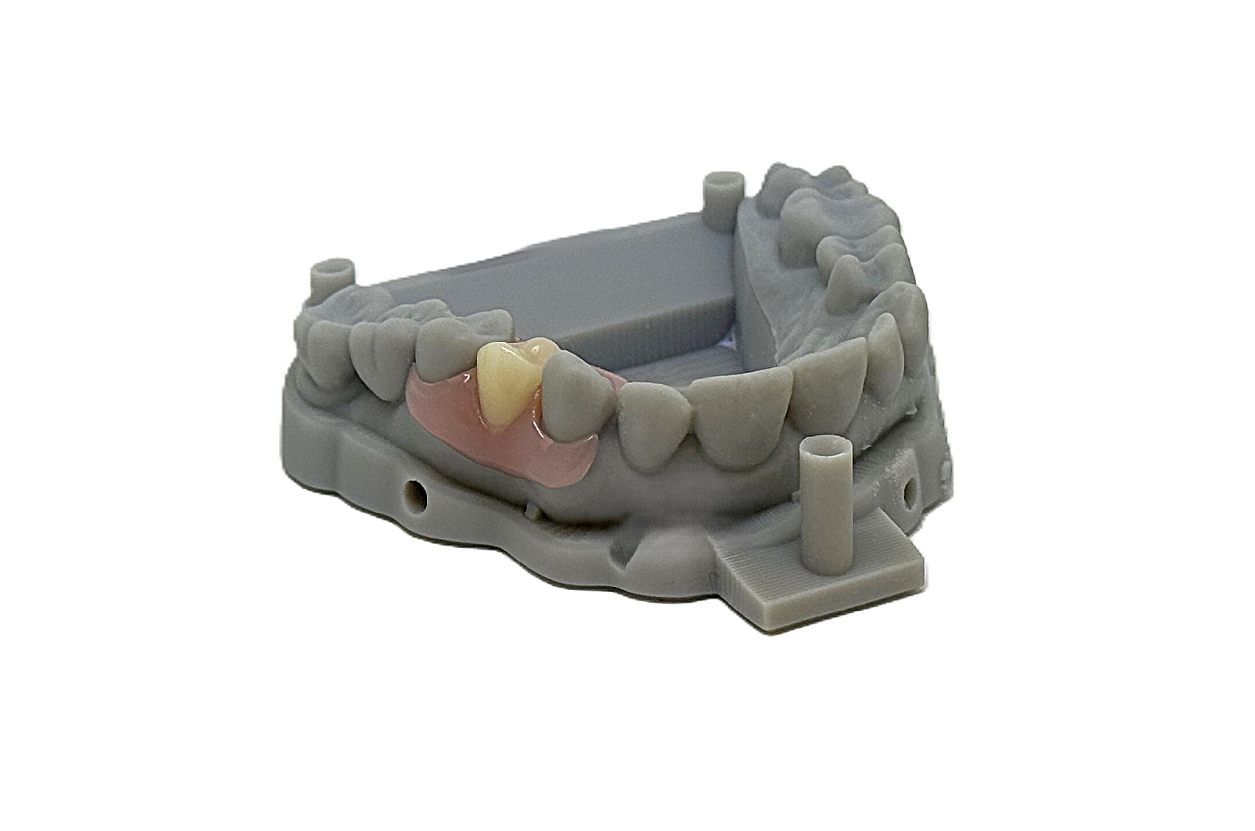 This solution includes a finished flexible removable partial nesbit. Both the teeth and base of the final prosthesis are CAD/CAM designed and manufactured. The teeth are milled from multi layered PMMA and the base is 3D printed. Both are then fused together, finished and polished, for an extremely resilient and esthetic flexible partial. This option includes a 3D-printed duplicate model.